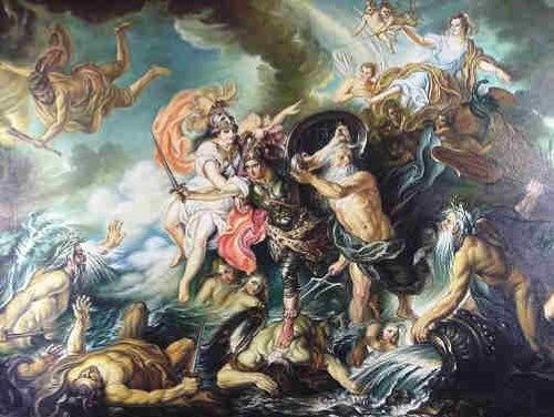しています。中央の裸おじさんがゼウス、右側が妻ヘラ、左隣がアテナ、