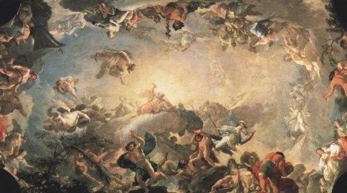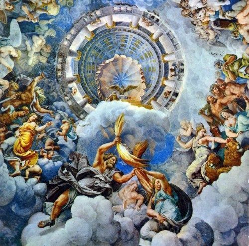 イタリアのテ離宮の天井画のフレスコ画。天上一面にティタノマキアの