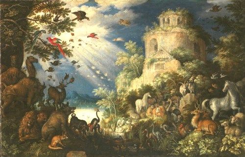 神話画なんです。右下に小さく吟遊詩人オルフェウスが描かれています。