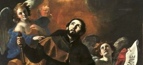 美しい天使に囲まれたザビエル。右側のラテン語は手で隠れていて