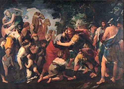 二人は憎み合ったままで、20年の歳月が経った頃。ヤコブの使者がエサウの元に現れ、「再会しよう」と持ち掛けました。エサウはそれに400名の共を連れて応じます。ヤコブはその数に恐れを成し、7回身を屈め、低姿勢で待ちました。しかし、エサウは弟を憎むことなく、過去の事を水に流して抱きしめたのです。ヤコブもそれに返し、二人はやっと和解したのでした。