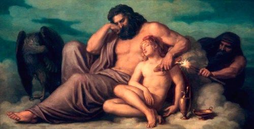 今までオリュンポスの神々の給士係は青春の女神へーベーでした。しかし、彼女はヘラクレスの妻となり、給士をやめることとなりました。(一説には神々に酌をしている時、転んでしまったからとされています) 最高神ゼウスはイーデー山で友達と遊んでいるガニュメデスを発見し、その美しい姿に惚れ込んでしまい、鷲に変身して彼をさらっていってしまったのです。天上へ連れてこられたガニュメデスは永遠の命と若さを与えられ、神々の給士係として任命される事となりました。