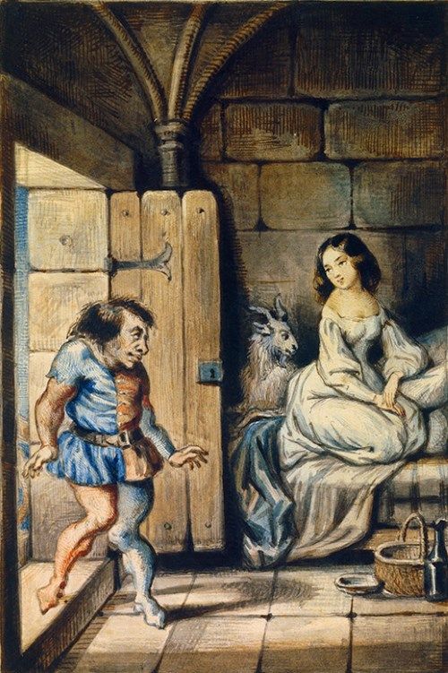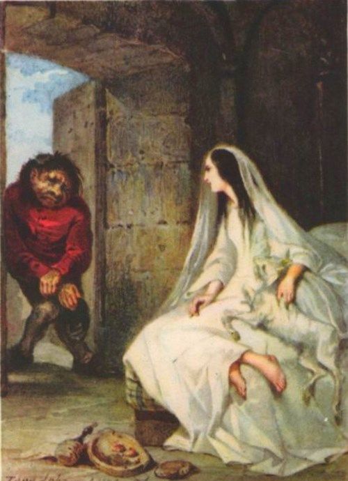 彼女をノートルダム大聖堂にかくまうカジモド。美女を前にして、