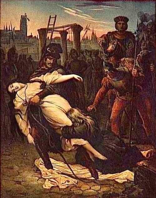 計略は失敗し、カジモドは捕らえられて彼女は衛兵フェビュスと付き合うようになります。捕まったカジモドは街でさらし者になっていましたが、エスメラルダだけは彼を庇った為、恋心を抱くようになりました。フロロはエスメラルダを諦めきれず、二人が逢引きしている場へ行き、フェビュスを刺して逃げます。彼女はフェビュスを重体にした濡れ衣を着せられ、魔女裁判により死刑が下されました。