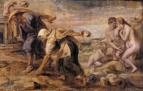 デウカリオンは父プロメテウスより警告を受け、方舟を作って食糧を入れて妻ピュラーと乗り込んでいた為、難を逃れました。9日間水上を漂ってようやく水が引いた時、二人はパルナッソス山へと到着しました。デウカリオンはピュラーと共に河のほとりの神殿でゼウスに生贄を捧げ、「人間を蘇らせてください」と祈ります。ゼウスはその願いを聞き届け、「お前達の顔を布で包み、母の骨を後ろに投げよ」というお告げを与えました。