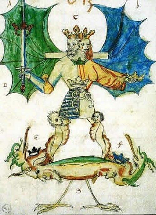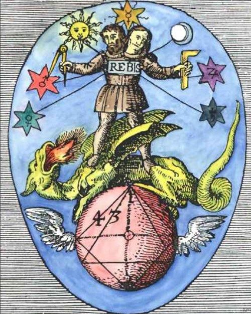 男女を統合して完全体になった存在は「アンドロギュノス(両性具有)」と呼ばれ、究極の真理とされてきました。錬金術の世界においてアンドロギュノスの姿は半分が男性で半分が女性の姿をした王の姿で描き、一対の翼を持ち、龍を踏み付けたり、定規や蛇、盃などを手に持っています。また、この存在はレビス(Rebis)とも言われ、ラテン語で「2つの部分から成る者」の意味を含んでいます。