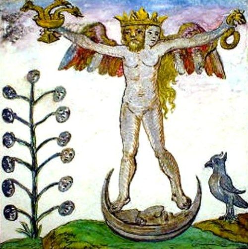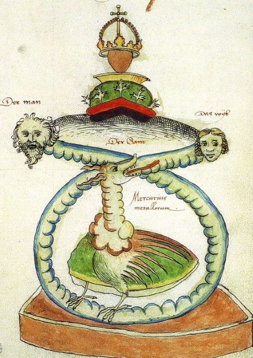 一見、錬金術における金の錬成と完全性の確立は関係ないように思われますが、二つは深く結びつき合っています。金は完全なる金属と考えられており、不純物のない純金が「賢者の石」であるともされていました。金を錬成するには、かなり複雑な処置を得て水銀と硫黄が化学反応により結合しなければなりませんでした。それは「化学の結婚」と呼ばれ、男女のアンドロギュノスの結合と象徴的に類似しているように思います。