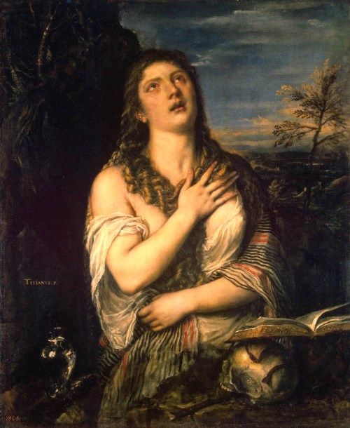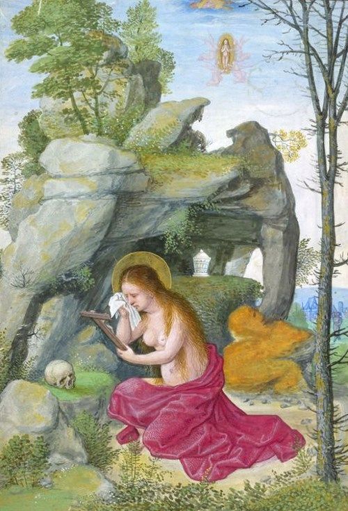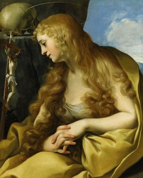 キリストが磔刑され、三日後に復活して天へと昇った後、彼女は兄のラザロと姉のマルタと一緒にフランスのマルセイユへと渡りました。そこで布教活動を行い、晩年には洞窟で隠遁生活を行いました。その生活は30年余り続き、亡くなったとされています。十字架と頭蓋骨を前にし、自らの罪を悔悛する主題は人気があり、多くの画家に描かれています。