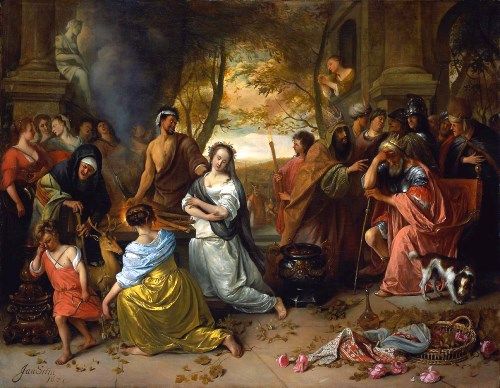 アガメムノンが娘イピゲネイアを生贄にするシーンが描かれています。