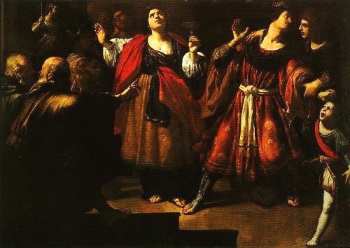 夫マシニッサのようなおじさんから毒盃を受け取っているソフォニスバ。
