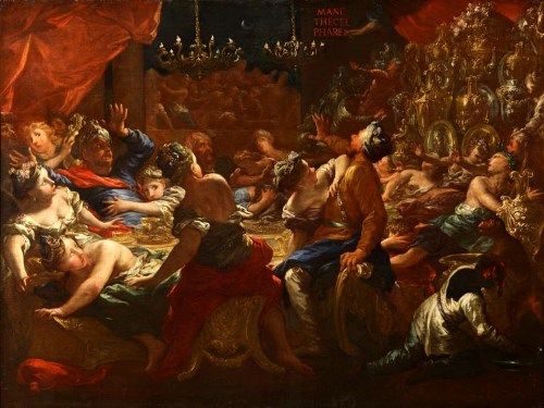 旧約聖書の「ダニエル書」によると、ある日、ベルシャザルはが1000名もの貴族や後宮の者達と宴を開き、ワインを飲んでいました。突然、人間の手の指が表れ、壁に字を書くという超常現象が起こります。ベルシャザルは戦慄し、その字が読める者を探しましたが、誰も現れません。母親が「父ネブカドネザルの治世中にダニエルという神官長がおりました。彼ならいけるかもしれません」と進言した為、ベルシャザルはダニエルを呼び、文字の意味を聞いてみました。