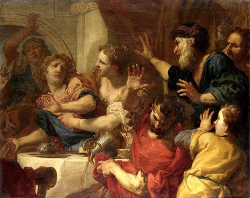 ベルシャザルは宙を仰いで恐れている。中央の夫人も何かを