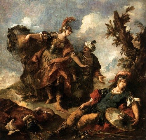 キリスト教徒の恋人達が互いを護ろうと「私が犯人です」とムスリムの王に嘆願していたところ、ムスリム側の女騎士クロリンダが二人を救いました。その後、クロリンダはキリスト教騎士タンクレーディを愛してしまいます。しかし、アンティオキアの王女エルミニアも彼を愛してしまい、クロリンダに対して激しい嫉妬を感じました。彼女がクロリンダの武具を盗んだところ、キリスト教徒に間違われて攻撃されてしまい、逃げて羊飼いの一家に助けられました。クロリンダは夜襲の際、誤って恋人タンクレーディに殺されてしまいます。彼女はこと切れる際、キリスト教に改宗しました。
