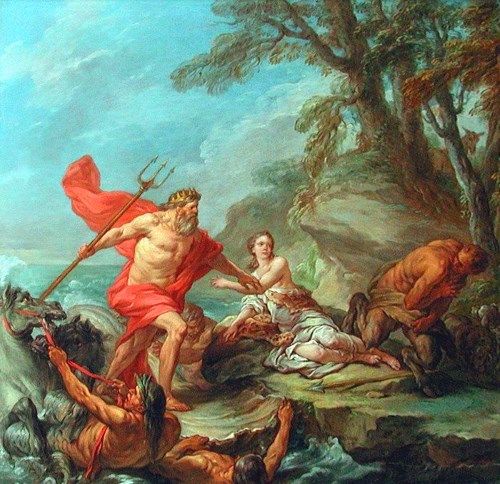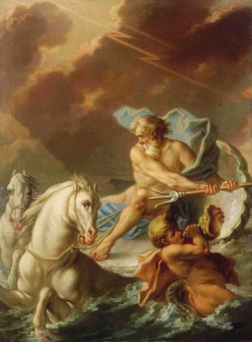 高い地位を持つポセイドンは海と大陸を支配し、最大の武器である三又の矛(トライアナ、ローマ神話ではトライデント)を使って津波や嵐、地震を引き起こす事ができます。海に棲むネレイドのアムピトリテを妻にし、三人の子供がおります。出会った当初、アムピトリテは彼を嫌っており、求婚しようとすると彼女はオケアノス宮殿へ隠れてしまいます。ポセイドンはイルカたちに彼女を見つけるよう命じ、その中の一頭が発見して「ポセイドンは男前で偉くて強くて素敵だよ!」と説得し、アムピトリテを連れてくるのに成功しました。こうして二人は結ばれることとなり、功績を得たイルカは天へと上げられ、イルカ座になったとされています。