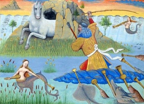 奥様も半分魚で楽器持っているし、馬穴に隠れているし。