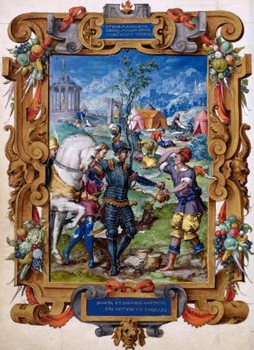 白馬を連れ、甲冑に身を包んだユダ・マカバイ。装飾が美しく、