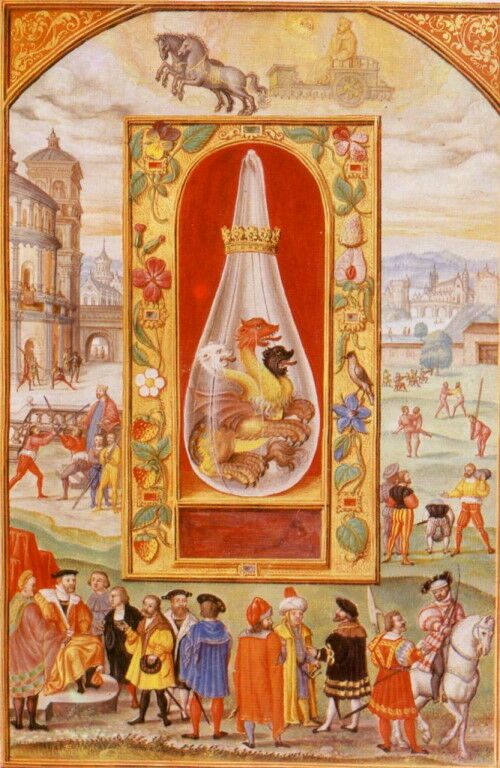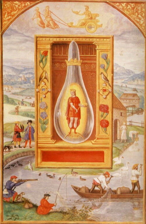 それらは錬金術による死と王の復活(卑金属からの金の物理的変換のプロセス)や、両極端の性質を持った存在の統合を表しており、フラスコ内部の生物達それぞれが、惑星に関連付けられているそうです。男女が一体となって両性具有となり、魂の卵が産まれ、その創造の象徴である卵に色々施し、孵化させることで完全ともいえる存在が生じる・・・とのこと。いかんせん知識不足で、詳しいことは分からず仕舞いで申し訳ありません^^; 挿絵の神秘的な美しさをお楽しみください。