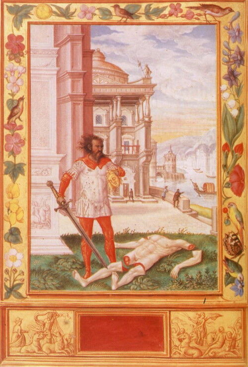 憤怒の表情で剣と生首を持つおじさんと、足元に転がるバラバラ死体。