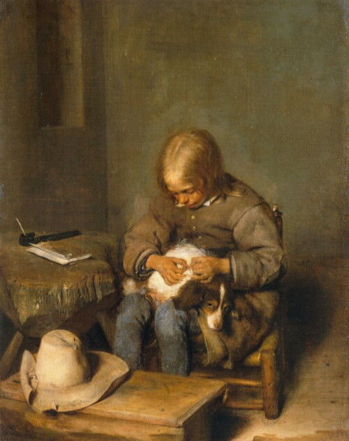 わんちゃんの蚤を丁寧にとる、優しい少年。猫や犬などの