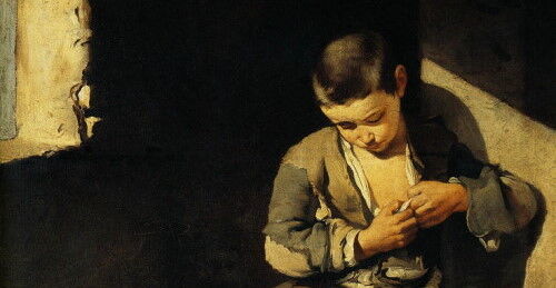 服がぼろぼろの貧しい少年が、一人静かに蚤をとっています。