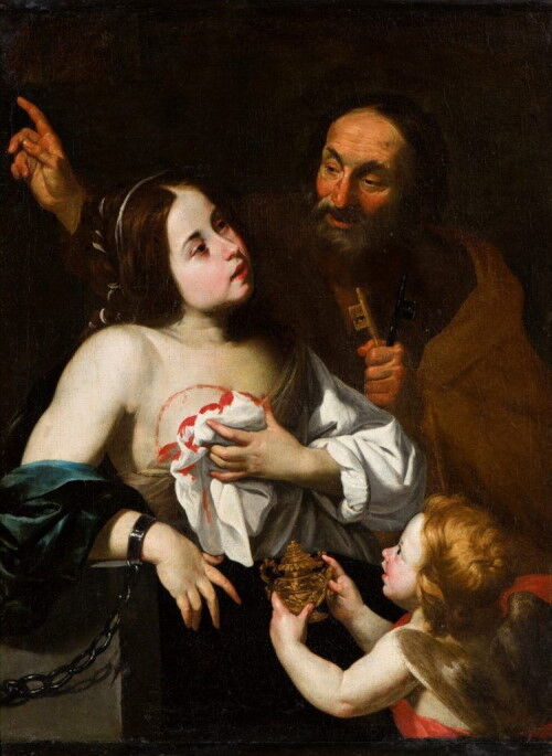 この物語に由来して、聖アガタのアトリビュート(持物)は乳房が乗った皿!なんともシュールですが、自らの切り取られた乳房をお皿に乗せて手に持っている姿として描かれるのです。聖ペトロが現れ彼女を介抱する絵画も画家によって何枚も描かれています。