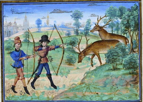 鹿を狙う二人の狩人。自分の背丈ほどもあるロングボウを